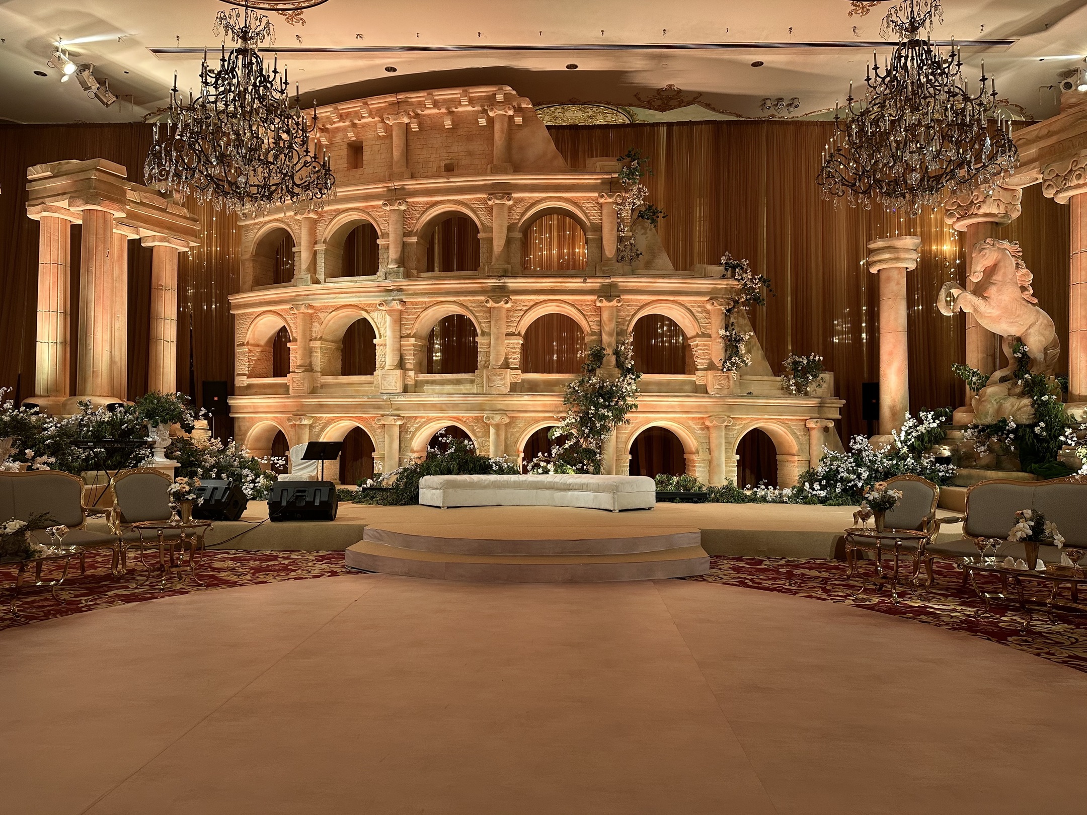 We transformed the ballroom into an imagined palace, arches rising like poetry, light cascading over mirrored floors, palms swaying beside fountains. Every detail drew from the romance of old Arabia, reinterpreted with modern precision and calm luxury.