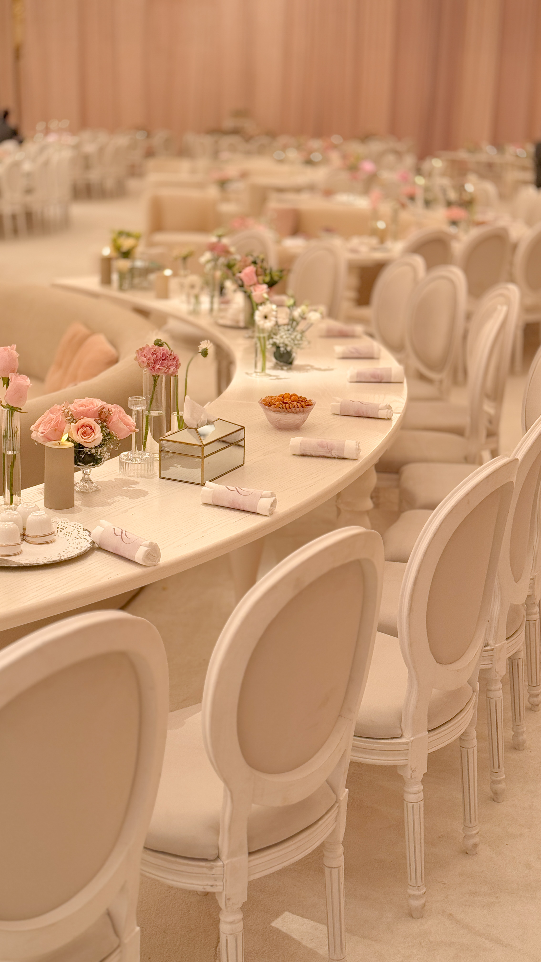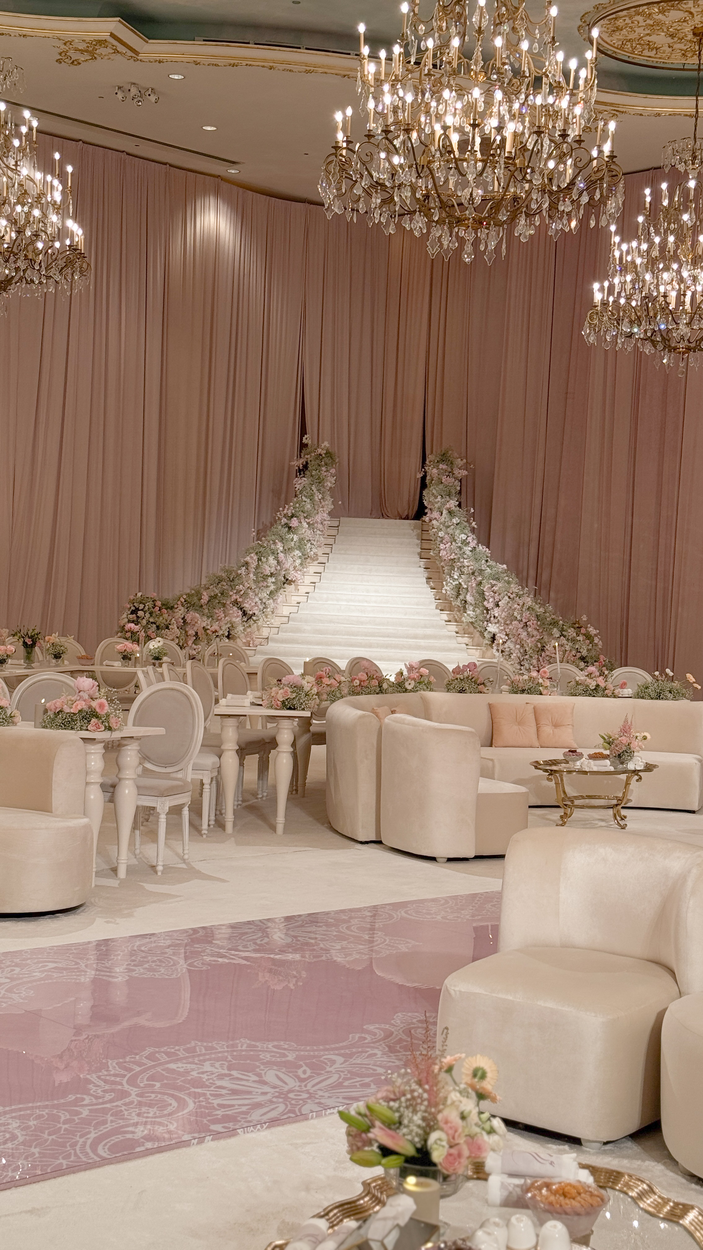 A study in proportion, texture, and light. Soft blush tones, structured florals, and curved seating redefined the ballroom into a calm, modern landscape. Every line was deliberate, every detail understated.